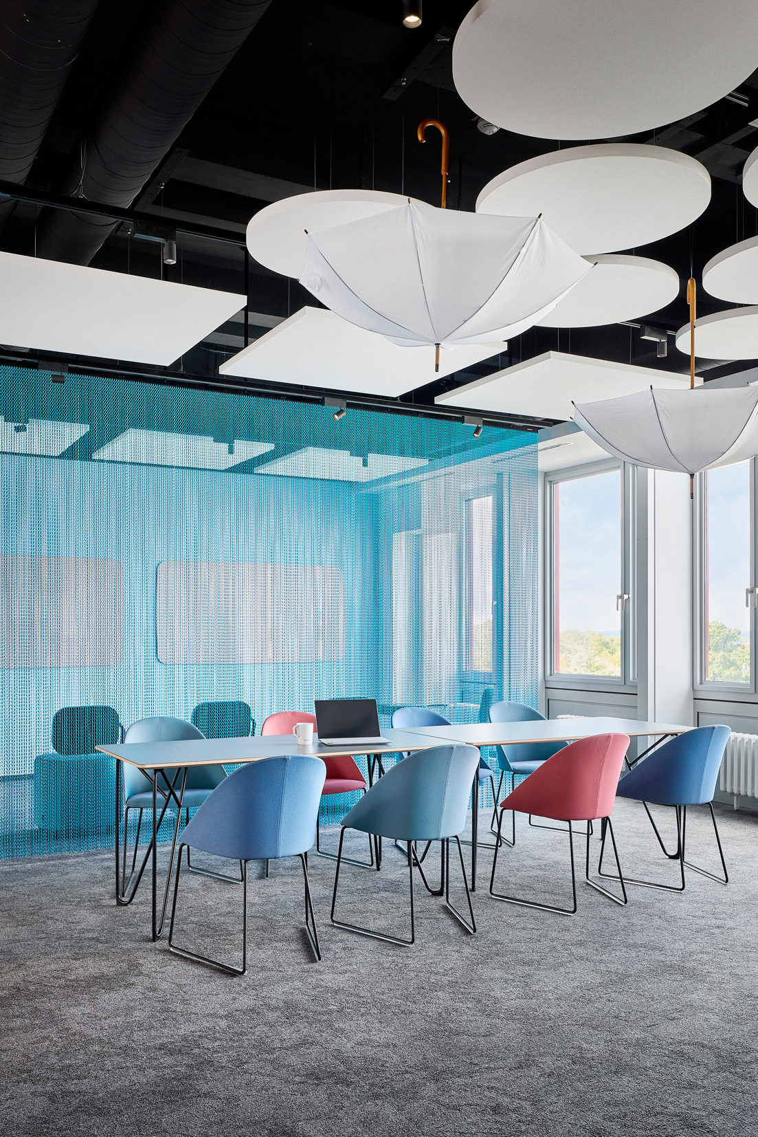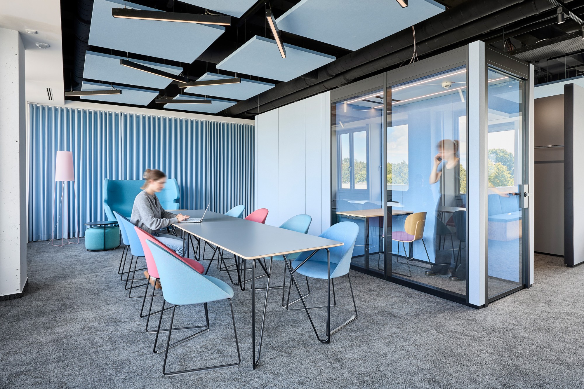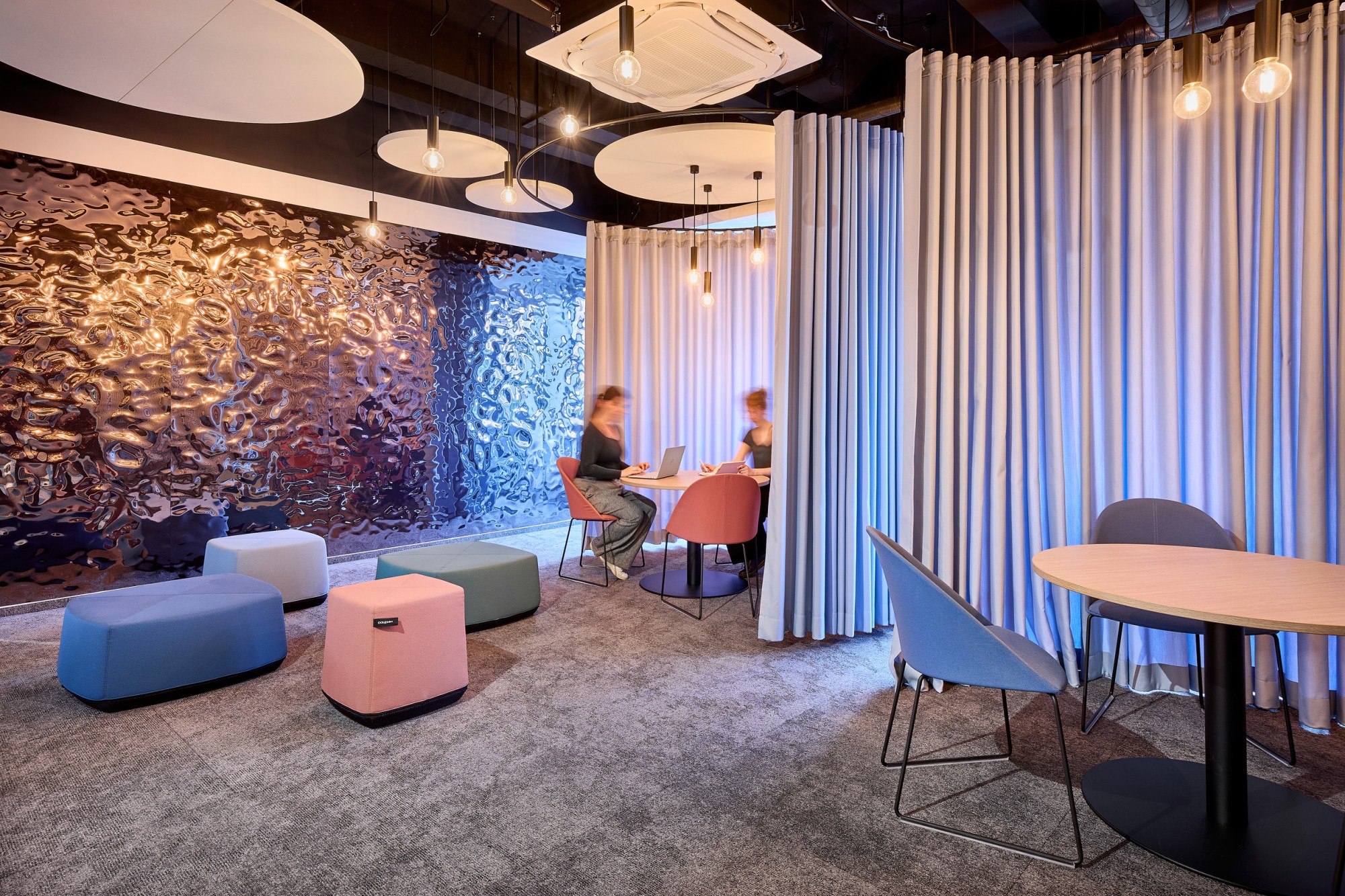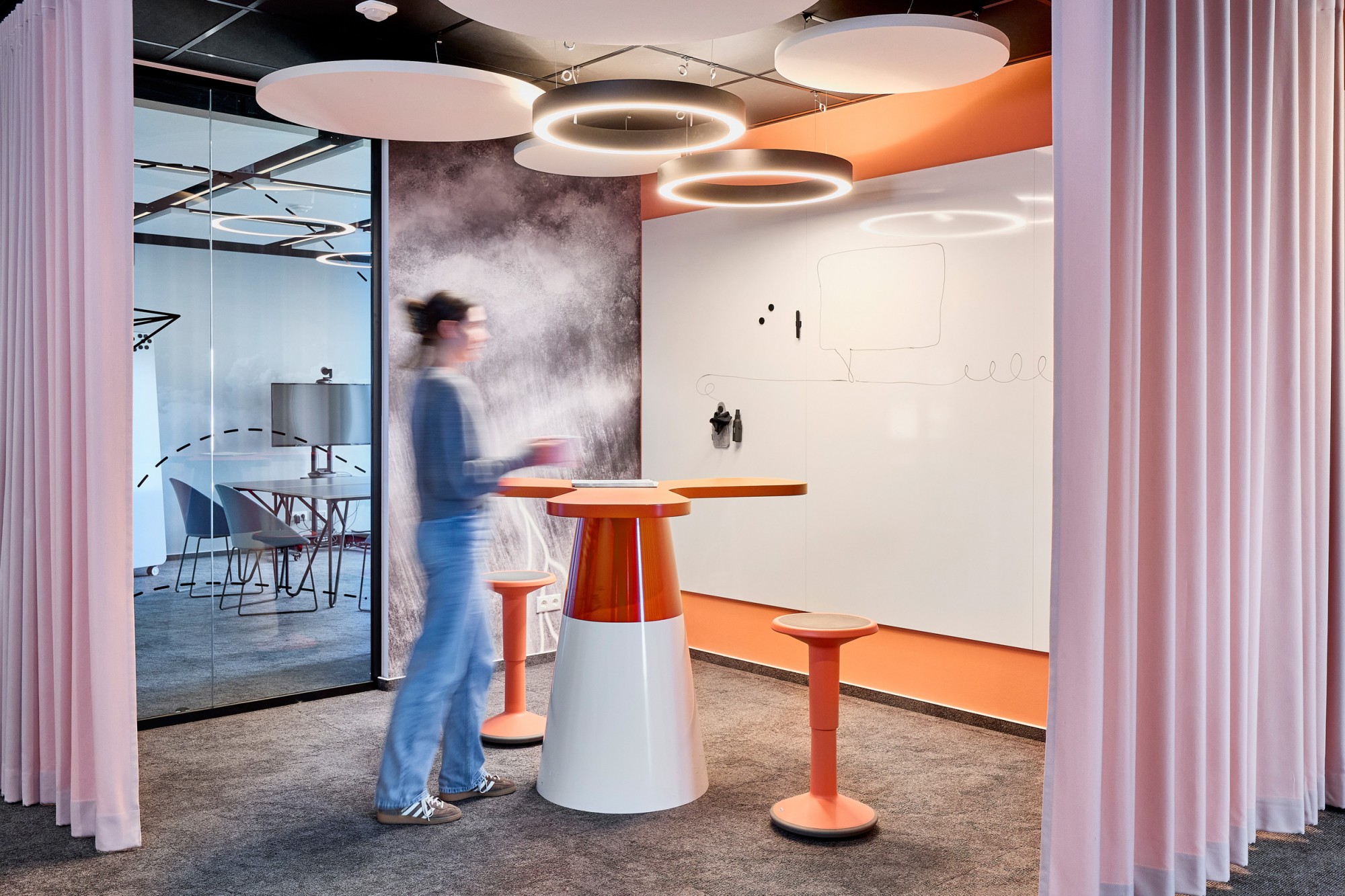 Neben klassischen Arbeitsplätzen finden sich großzügige Meeting- und Lounge-Bereiche auf der Etage, die durch Vorhänge flexibel voneinander getrennt werden können. Raum-in-Raum-Systeme bieten Rückzugsmöglichkeiten für fokussiertes Arbeiten.