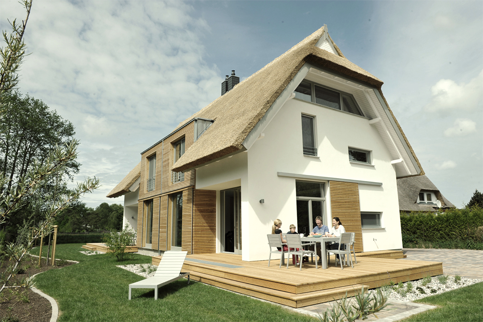 Der Neubau eines Feriendoppelhauses orientiert sich an der ortstypischen Bebauung des Fischerdorfes Prerow mit seinen strohgedeckten Häusern.