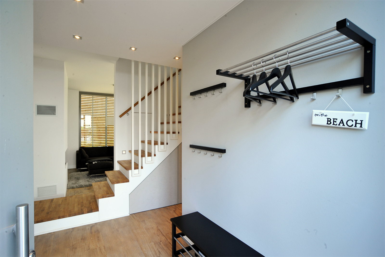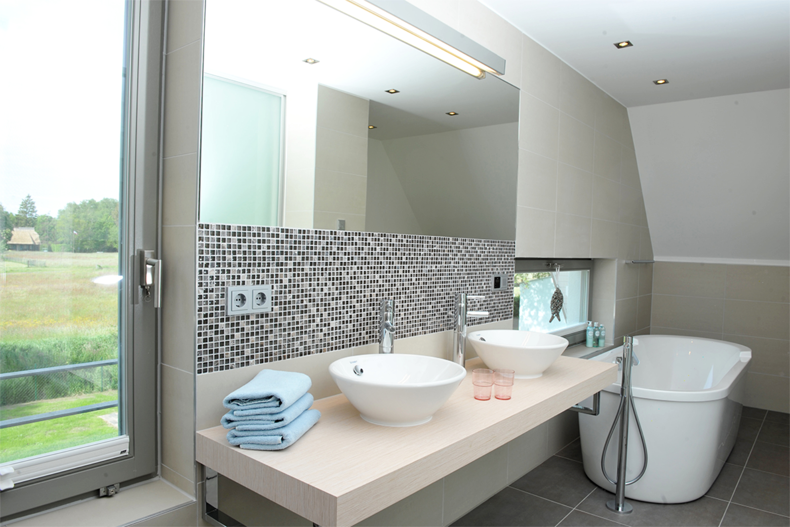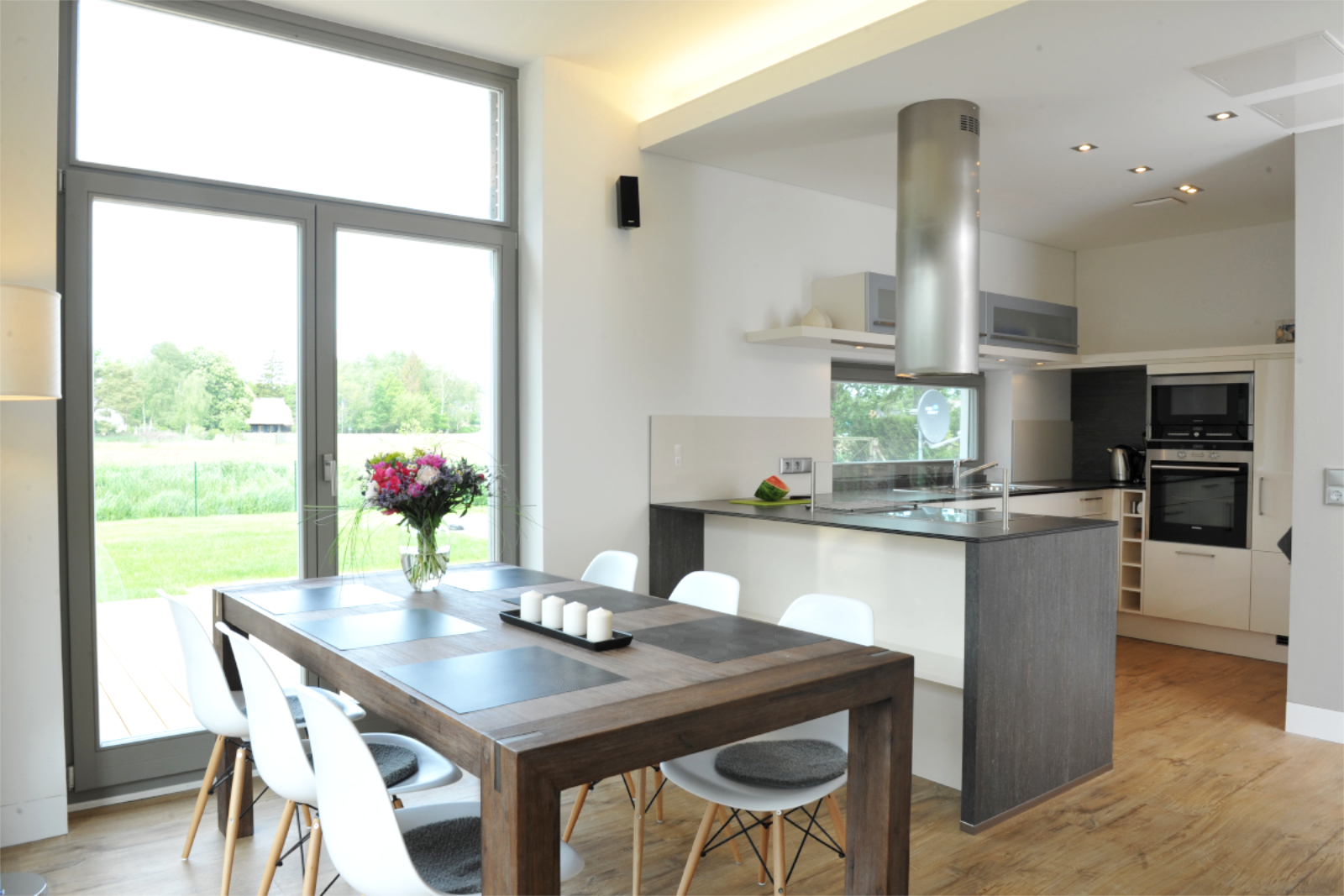 Die dominante Dachform der Krüppelwalmdächer wurde aufgenommen und mit modernen Elementen an der Fassade ergänzt. Die zeitgemäße Umsetzung spiegeln auch die innere Aufteilung und die Einrichtung wieder. Ein optimierter Grundriss und maßgefertigte Einbauten bieten großzügige Räume auf kleiner Fläche und eine schlichte aber gemütliche Atmosphäre. Neben hochwertigen Materialien ist das Haus mit neuester Technik, wie Raumlüftungsanlage und Erdgaskamin ausgestattet.