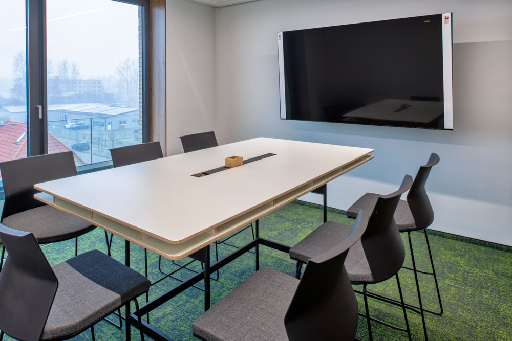 Dabei wurde der nachhaltige Leitgedanke des Entwurfes und die Formensprache der Architektur in die Innenräume übertragen.