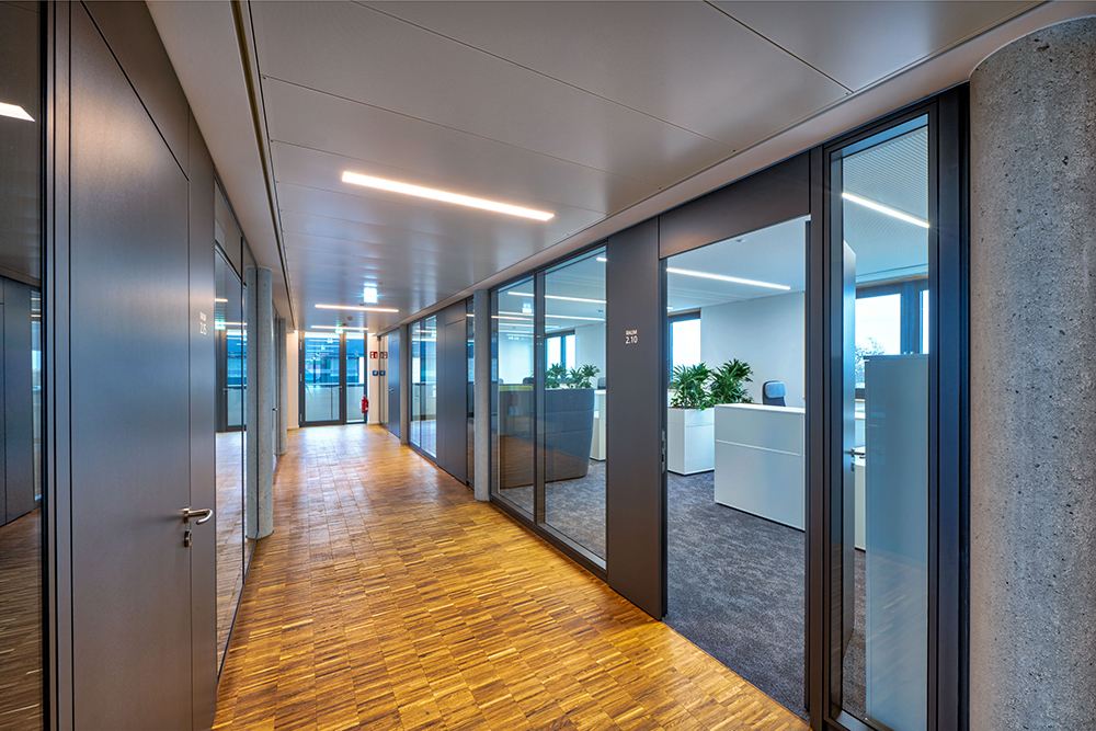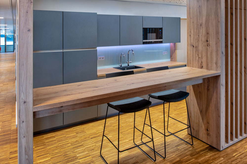 Der Einsatz von Holz an Boden, Wänden und Einbauten schafft einen warmen Hintergrund für die puristische Farbgebung und klare Materialität. Die verglasten Flurwände bieten Transparenz und somit eine maximale Interaktion zwischen den Büroarbeitsplätzen. Offene Pantries an den Flurenden sind beliebte Treffpunkte.