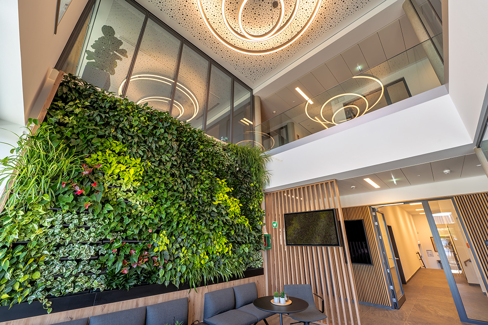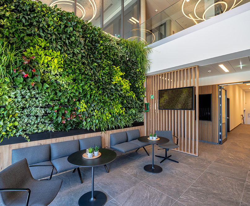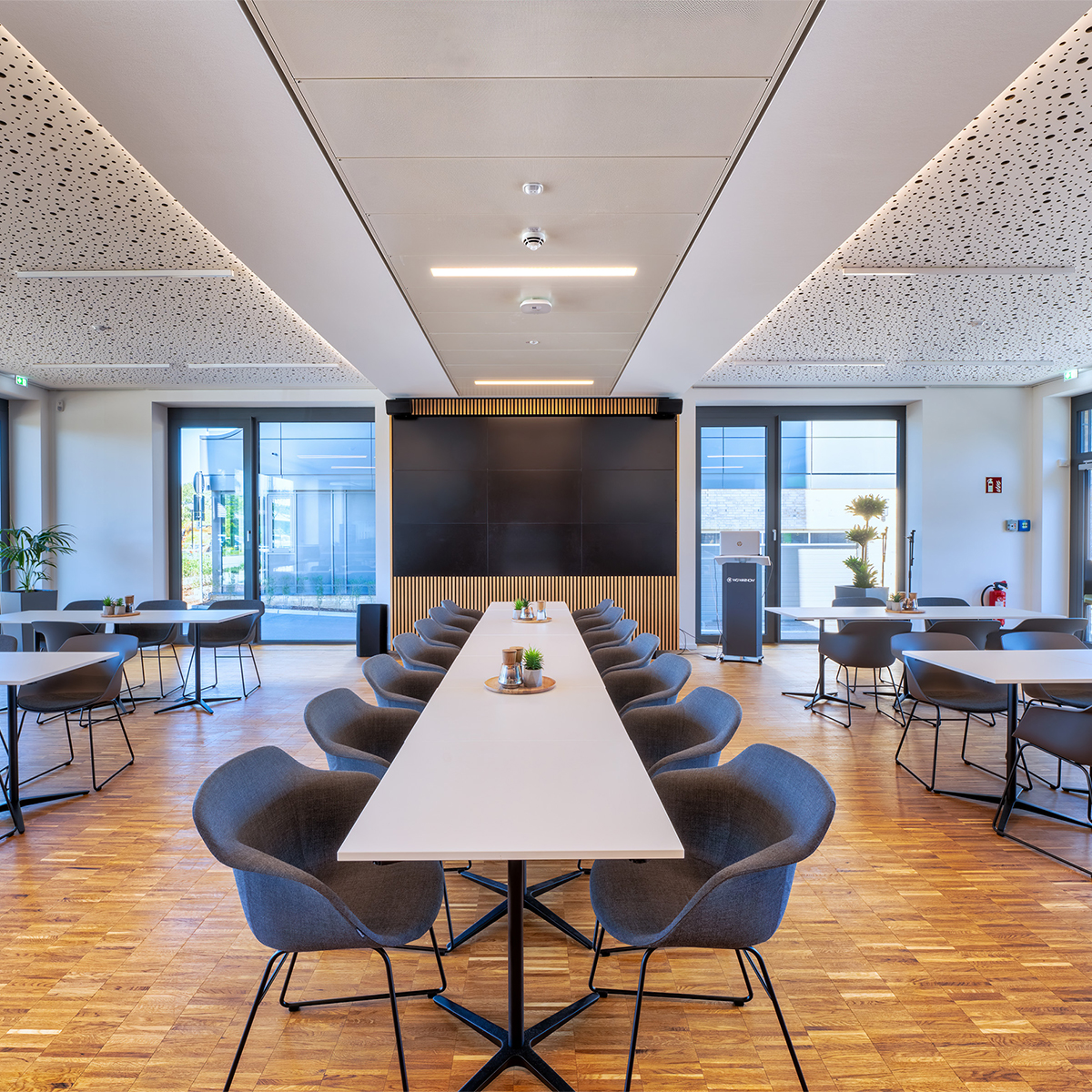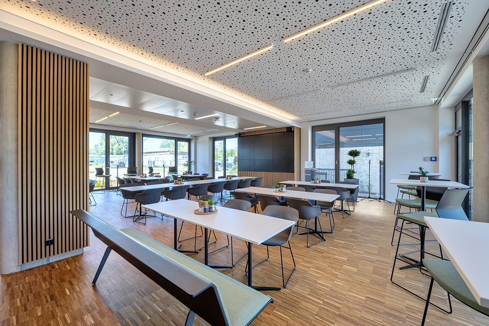 Das Foyer bildet mit einer natürlichen Begrünung an einer zweigeschossigen Pflanzenwand den passenden Empfang für den modernen Gebäudekomplex. Der Mehrzweckraum im Erdgeschoss wurde flexibel und locker möbliert, so daß in angenehmer Atmosphäre die tägliche Versorgung der Mitarbeitenden und auch verschiedenste Veranstaltungen wie Mitgliederversammlungen oder Weiterbildungen möglich sind. Ein großzügiger Fitnessbereich für alle Angestellten ergänzt diese moderne Arbeitswelt.