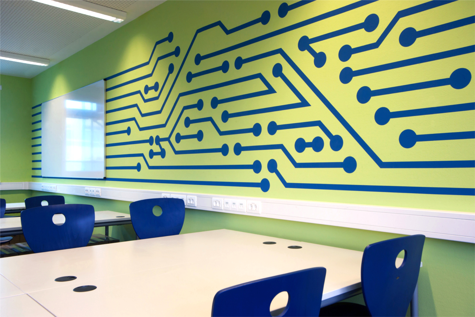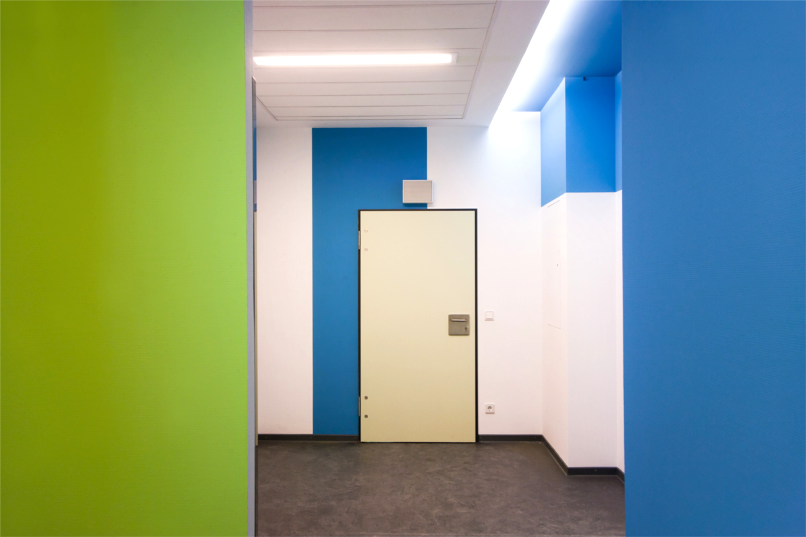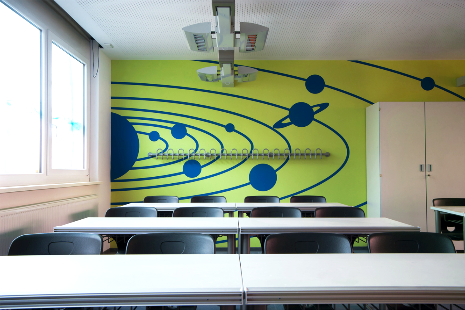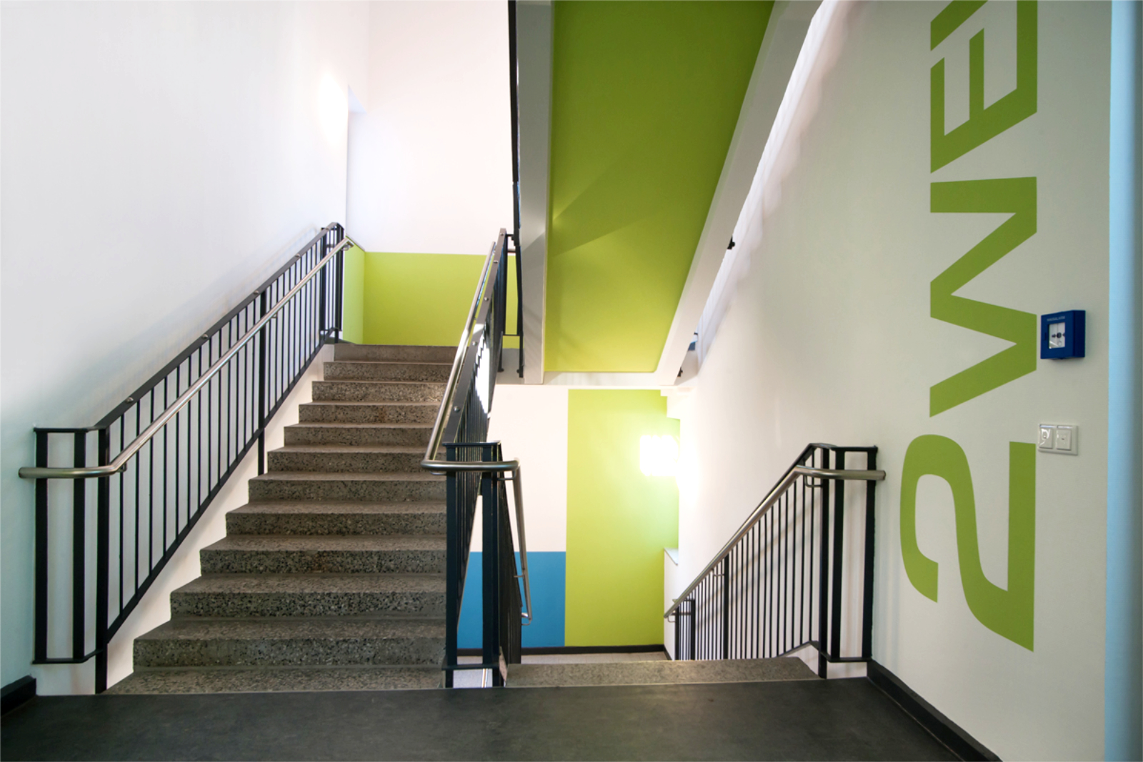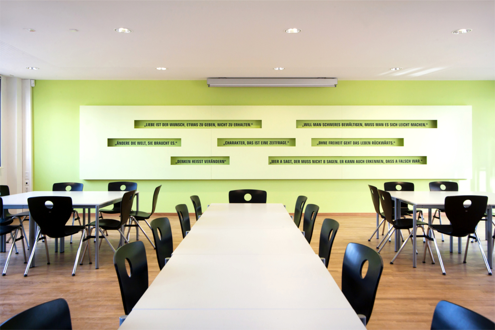 Eine Farbmischung aus Grün- und Blautönen gibt Orientierung und den Räumen eine freundliche Lernatmosphäre. Mit Liebe zum Detail wurde die Gebäudestruktur wiederbelebt und den individuellen Bereichen eine funktionsbezogene Note gegeben. Hingucker sind Sprüche des Namensgeber sowie sein Porträt, das über der einen Stirnseite der Fassade prangt.
