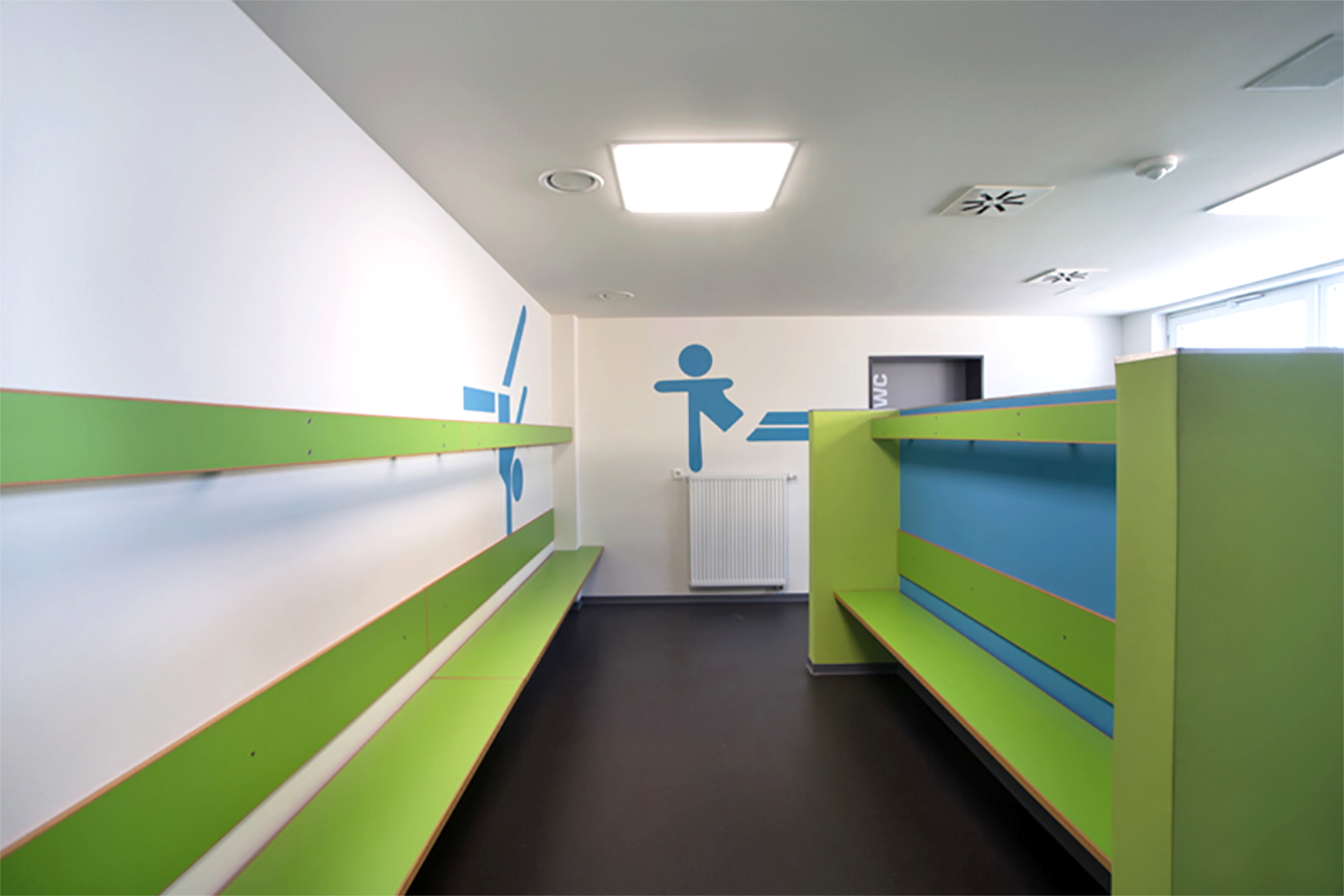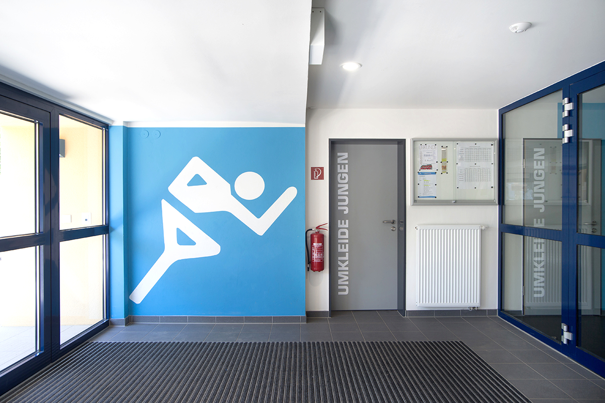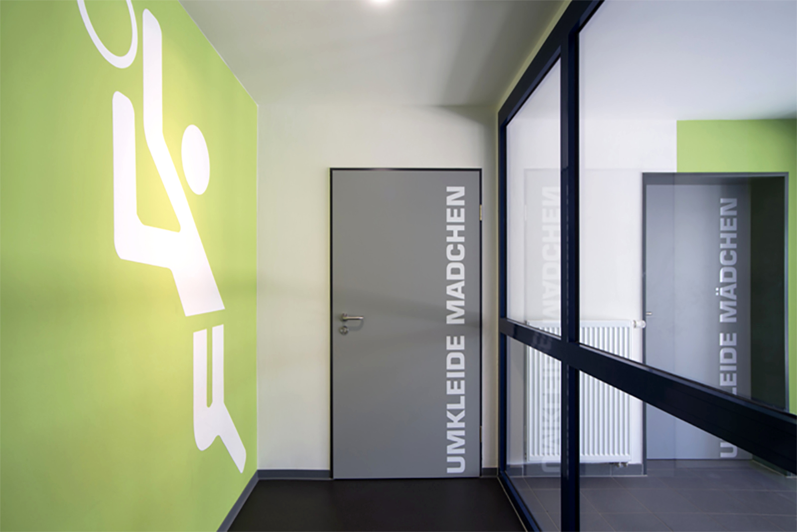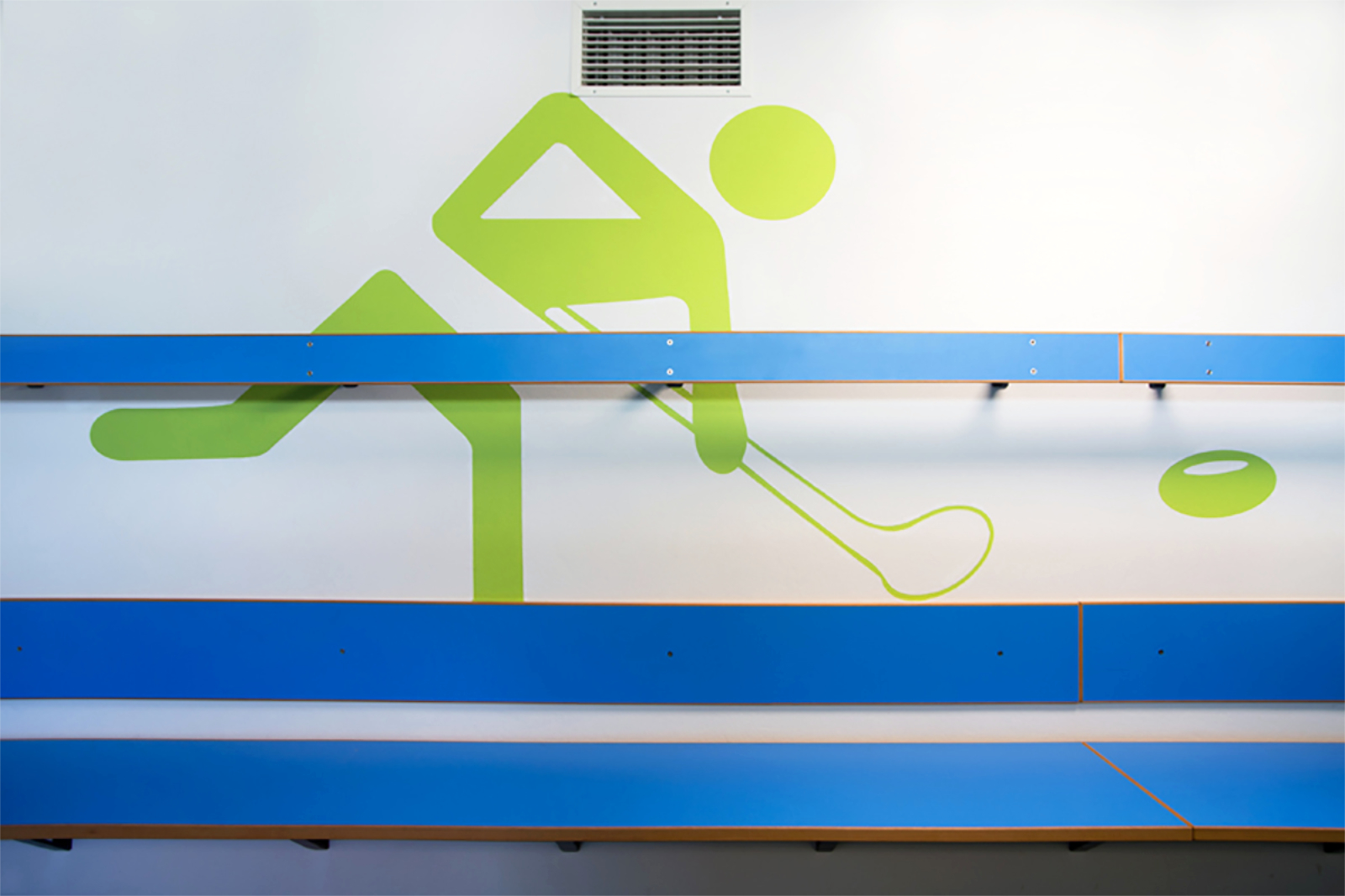 Ein Mosaik aus verschiedenen Blautönen gliedert die Fassade und verleiht ihr einen besonderes Charme. Im Inneren findet sich die Farbgebung der Schule wieder – Sportfiguren leiten die Schüler durch die Räume.