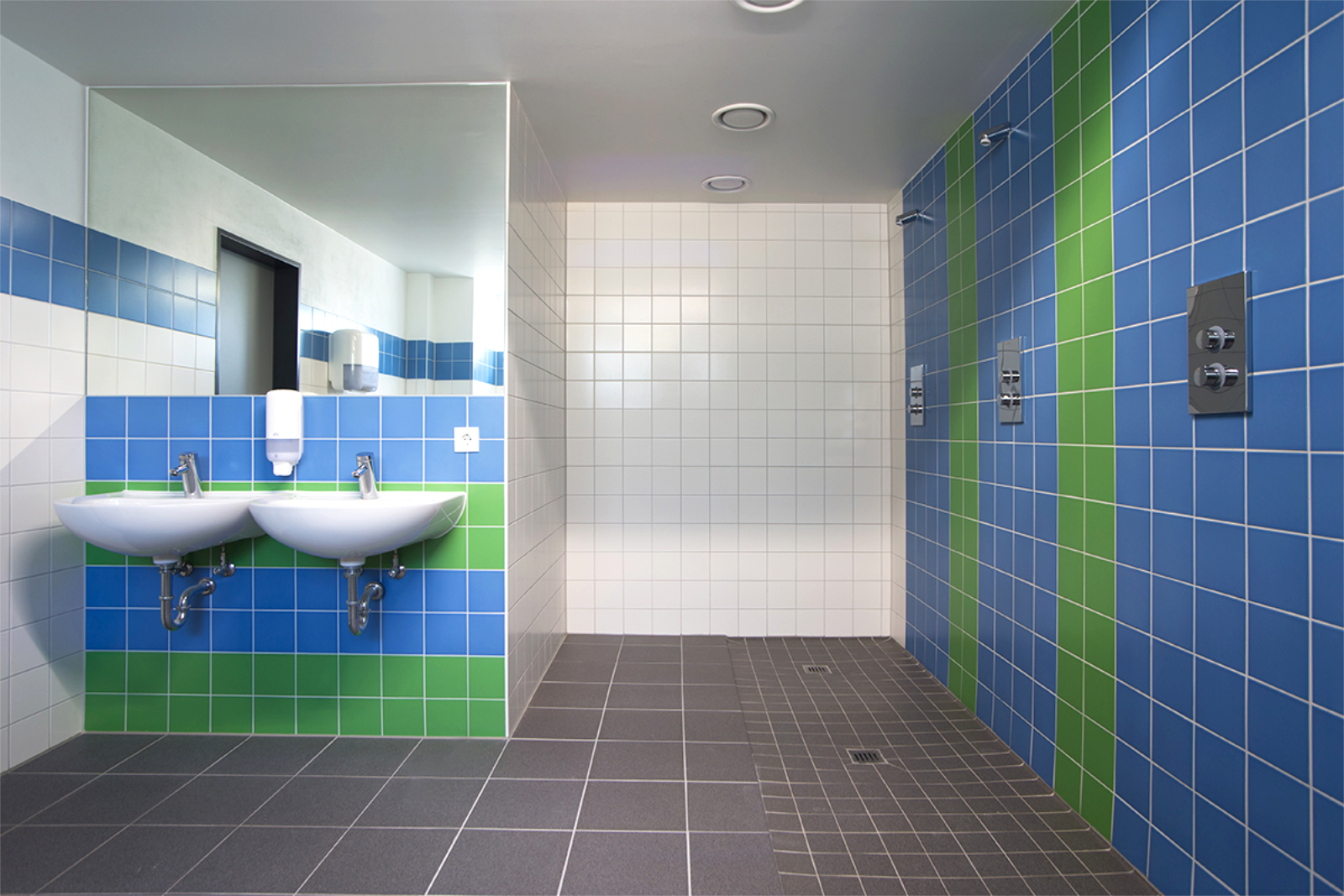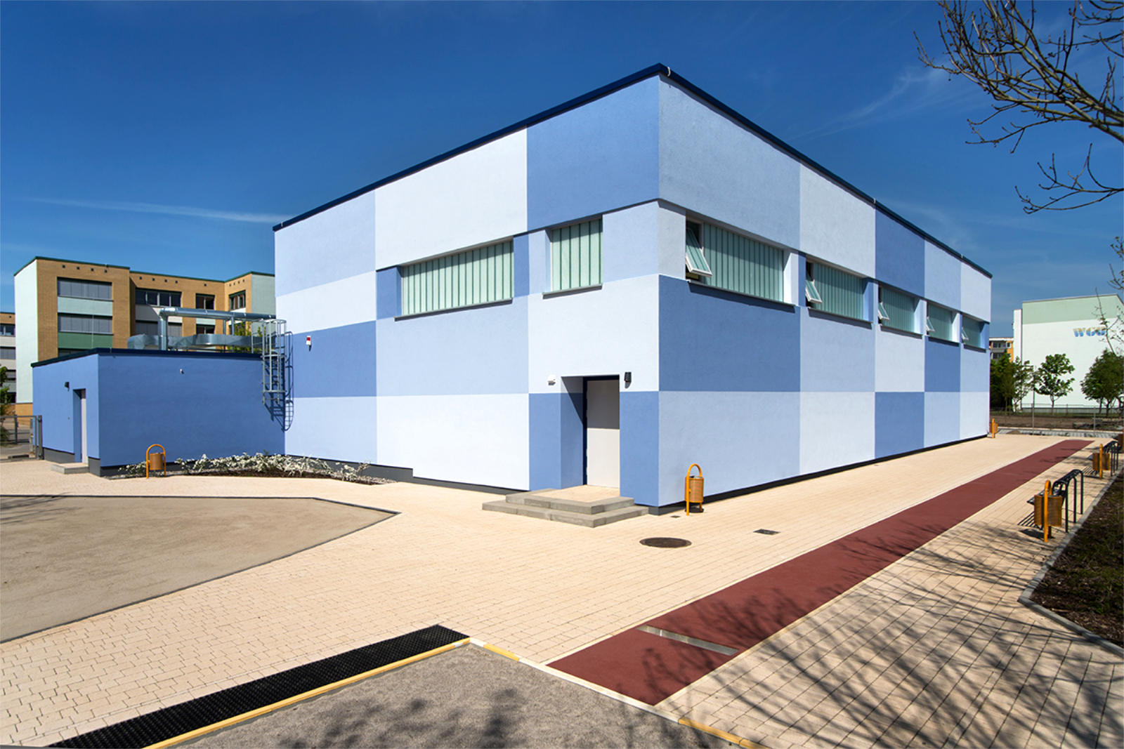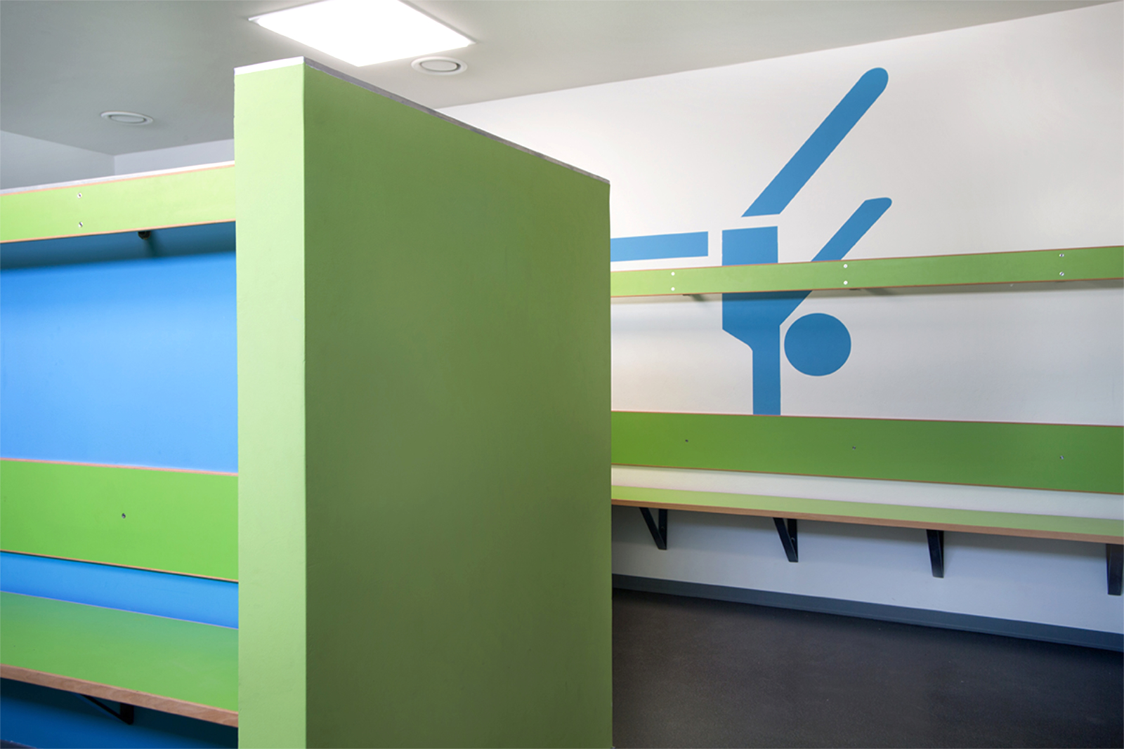 Ein Mosaik aus verschiedenen Blautönen gliedert die Fassade und verleiht ihr einen besonderes Charme. Im Inneren findet sich die Farbgebung der Schule wieder – Sportfiguren leiten die Schüler durch die Räume.