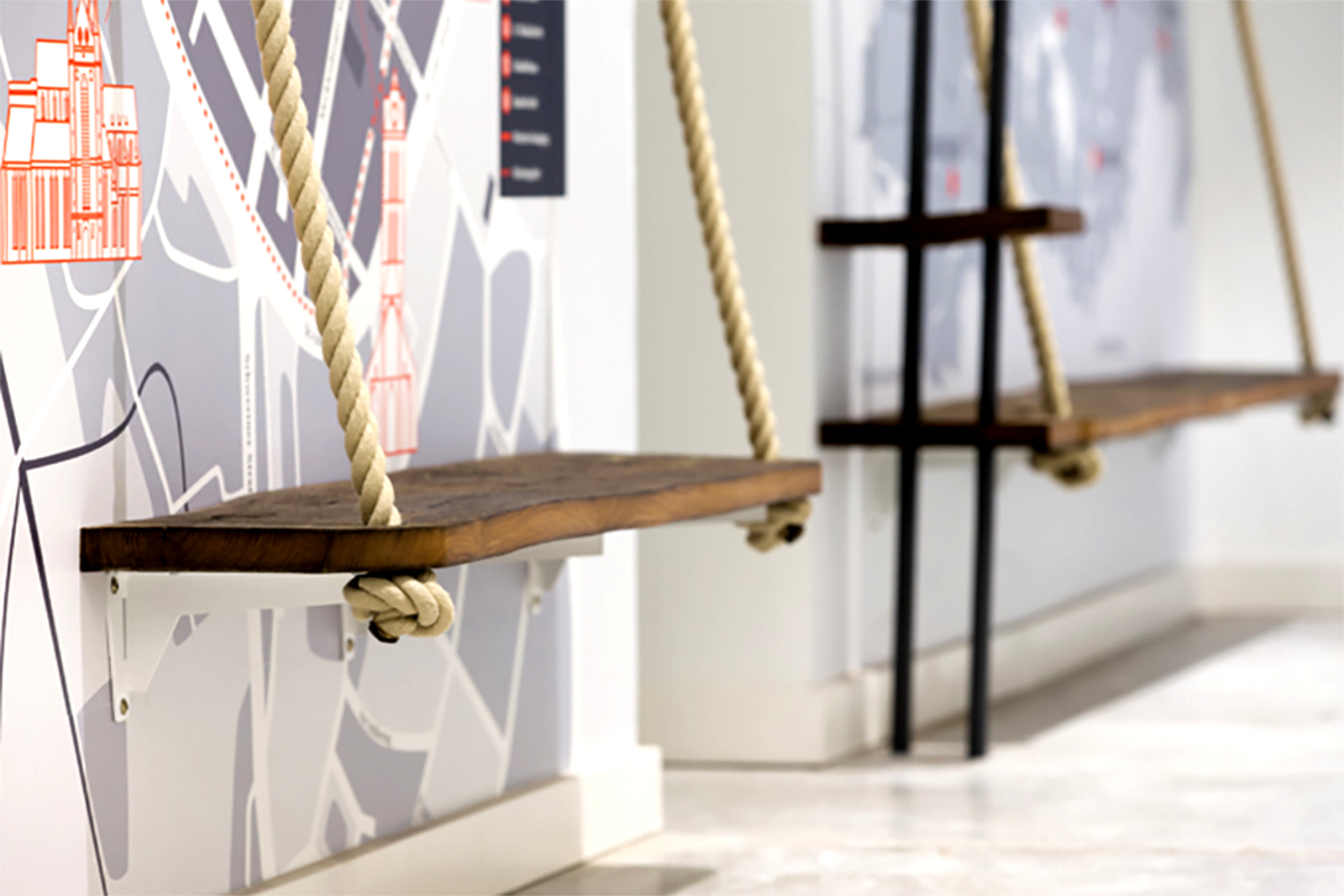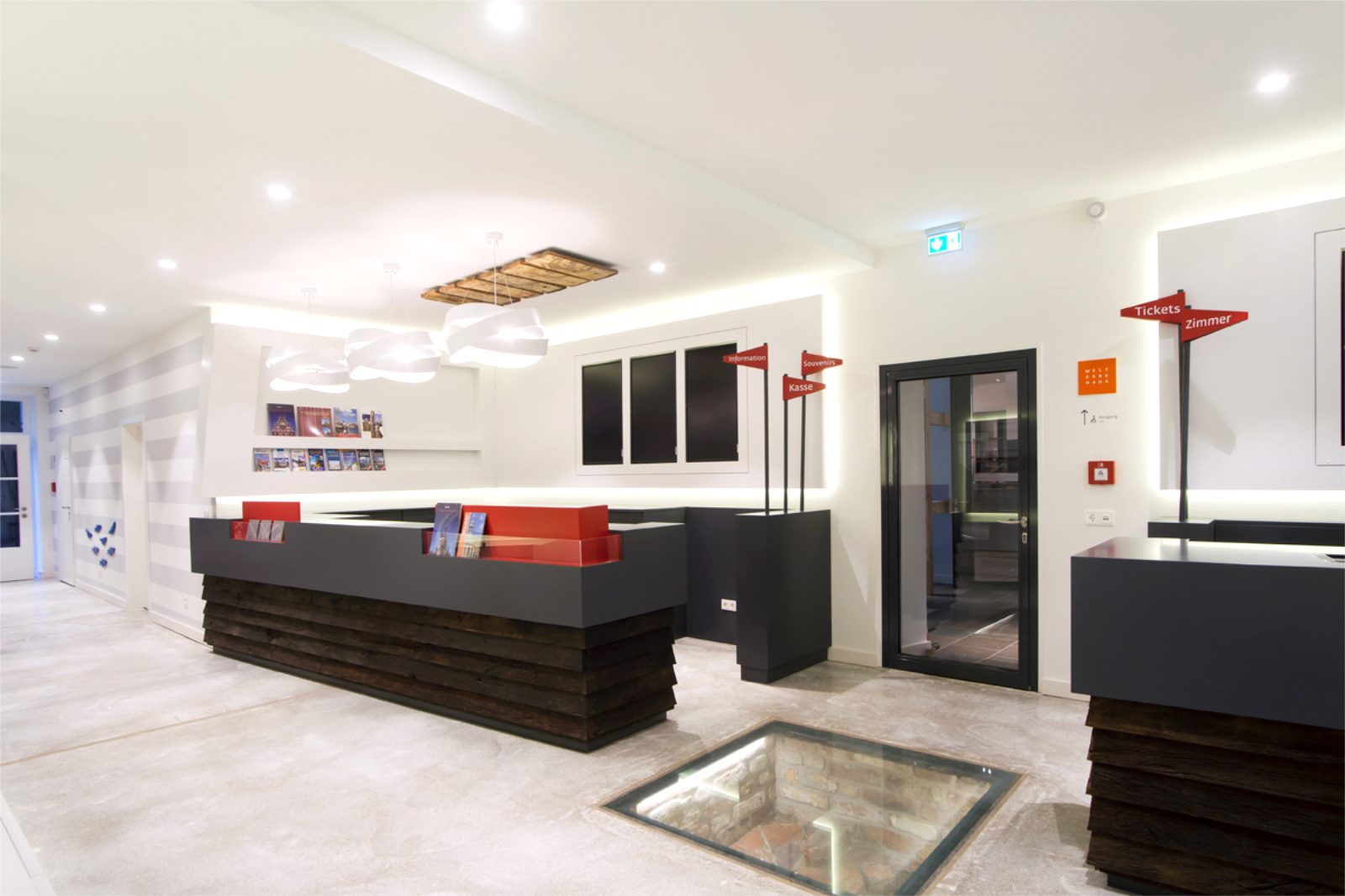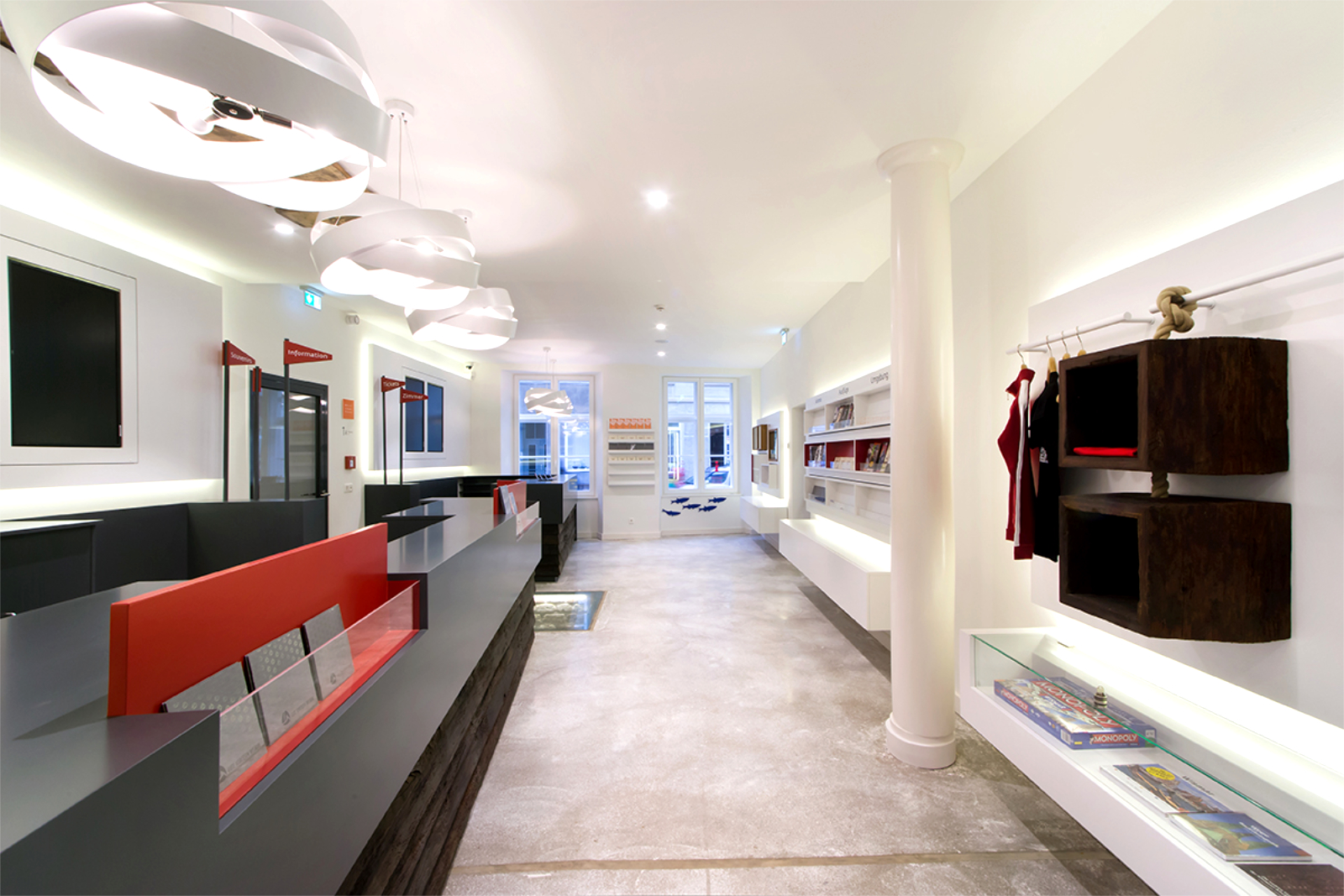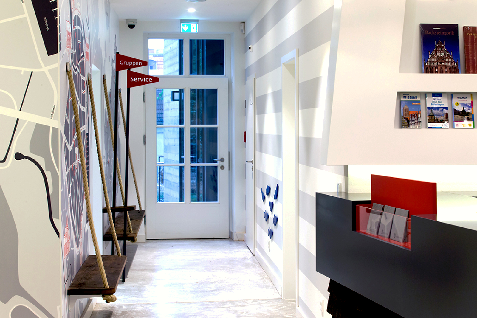 Die Materialien, Oberflächen und Gestaltungselemente zitieren die Besonderheiten Wismars und schaffen schon beim Besuch der Touristinformation Lust darauf die Stadt und die Umgebung zu erkunden.