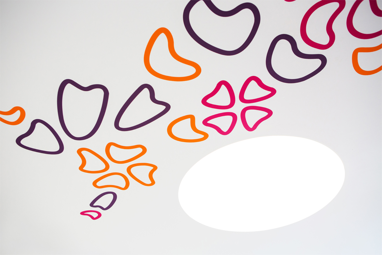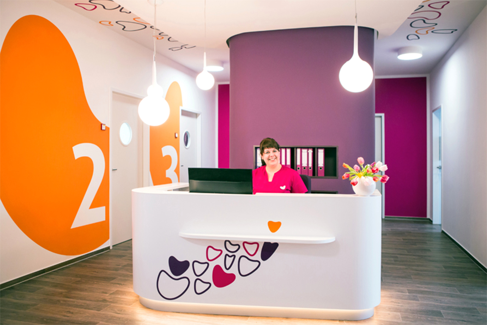 Das neu gestaltete Logo in Form eines Baumes zieht sich farbenfroh und verspielt durch die gesamten neuen Praxisräume.